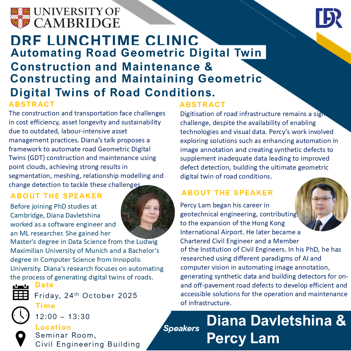 Diana Davletshina is a PhD student within the EPSRC Industrial CASE studentship at the Department of Engineering in partnership with National Highways, Costain and the Digital Roads project. Diana's research focuses on automating the process of generating digital twins of roads using existing large-scale visual and spatial datasets to reduce costs and enable performance optimisation, failure prediction and future scenario modelling. Diana holds a Master's degree in Data Science from the Ludwig Maximilian University of Munich and a Bachelor's degree in Computer Science from Innopolis University. Before joining PhD studies, Diana worked as a software engineer and an ML researcher | Percy Lam is currently a PhD student at the University of Cambridge. His PhD research investigates the construction and maintenance of a digital twin for roads, specifically focusing on detecting road defects. He graduated from the University of Cambridge and began his career in geotechnical engineering, contributing to the expansion of the Hong Kong International Airport. He later became a Chartered Civil Engineer and a Member of the Institution of Civil Engineers. Currently pursuing a PhD, he has researched using different paradigms of artificial intelligence and computer vision in automating image annotation, generating synthetic data and building detectors for on- and off-pavement road defects. The goal is to develop efficient, explainable and accessible solutions to enhance the operation and maintenance of infrastructure. |